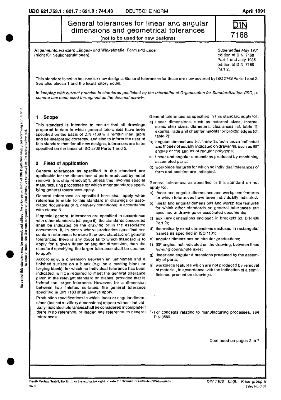 En son Nisan 1991 de yayınlanmış gözüküyor. Bu standart aktif değil. Yalnız karşılaştığımız resimlerde genel tolerans olarak bu standarda atıfta bulunuyor. Dolayısıyla ilgili işlerde DIN 7168 standardını kullanmak gerekiyor.